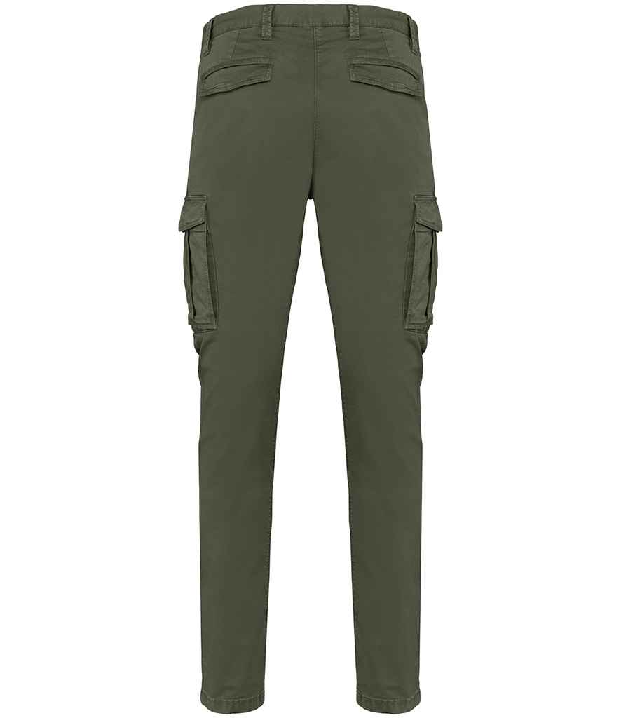 Rear piped pockets with flap and recycled metal button.