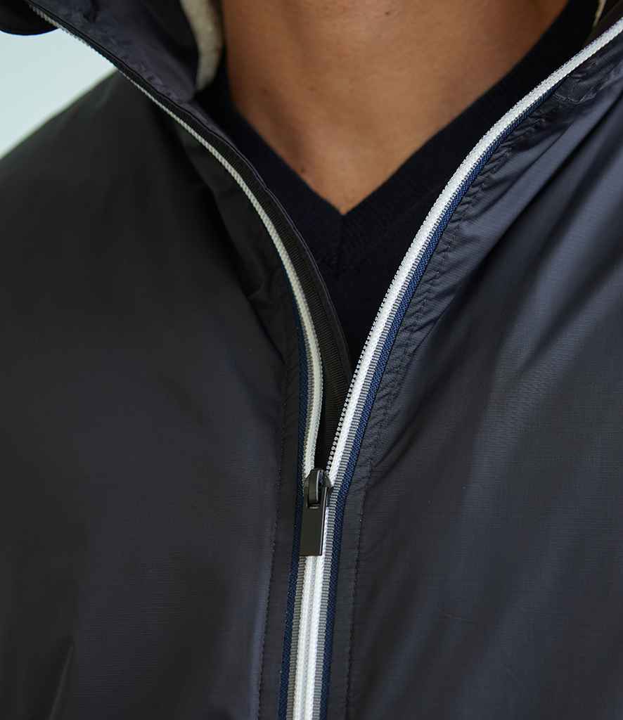 Contrast full length two way zip with inner zip guard.